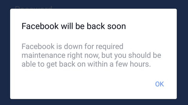 Keep getting thisFacebook Will Be Back Soon Facebook is down for required maintenance right now but you should be able to get back on within a few minutes. Facebook is down for required maintenance right now but you should be able to get back on within a few minutes. Meaning both internal and external Facebook services were unreachable.